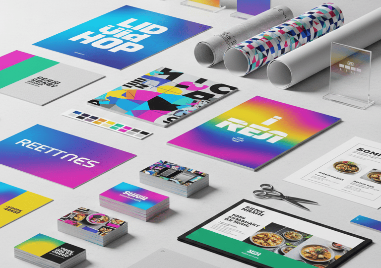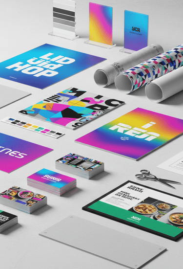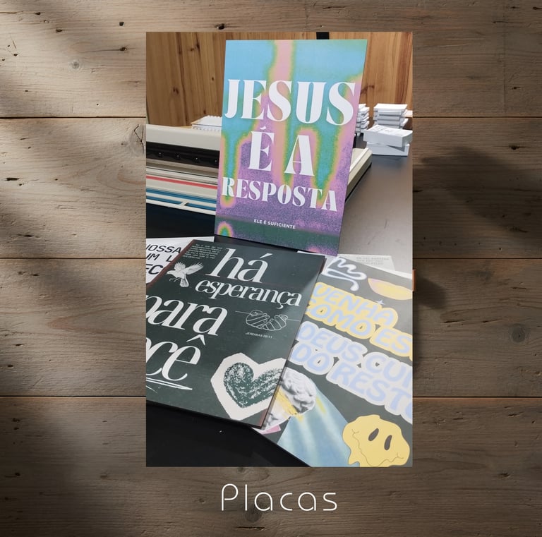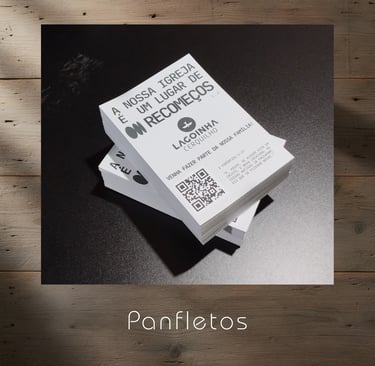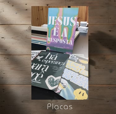 Cartões de visita, panfletos, cartazes, banners, placas, cardápios.